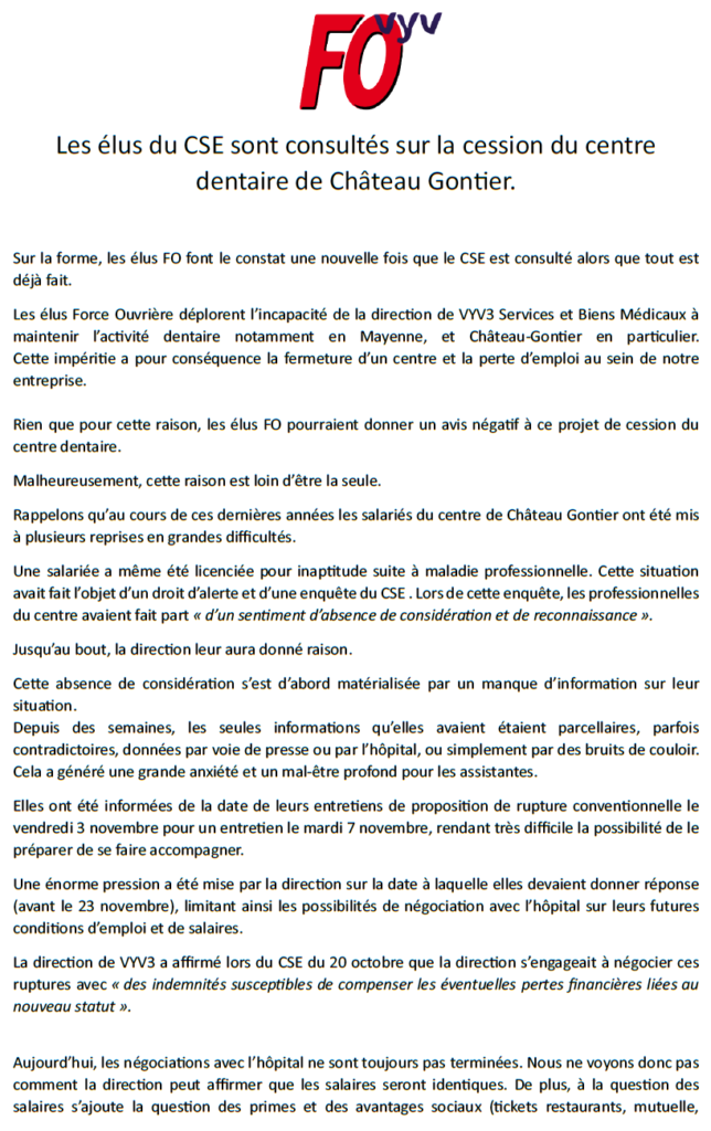 Lors du CSE de VYV3 Services et Bien Médicaux du 22 novembre dernier, les élus étaient consultés sur la fermeture des centres dentaire de Chateau-Gontier et de Changé.