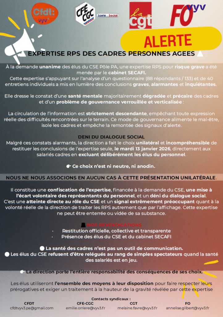 EXPERTISE RPS DES CADRES PERSONNES AGEES : L’intersyndicale exige une restitution officielle, collective et transparente en présence des élus du CSE et du cabinet SECAFI ! janvier 9, 2026 fovyv Uncategorized, VYV3 PDL Pôle Personnes Agées 0