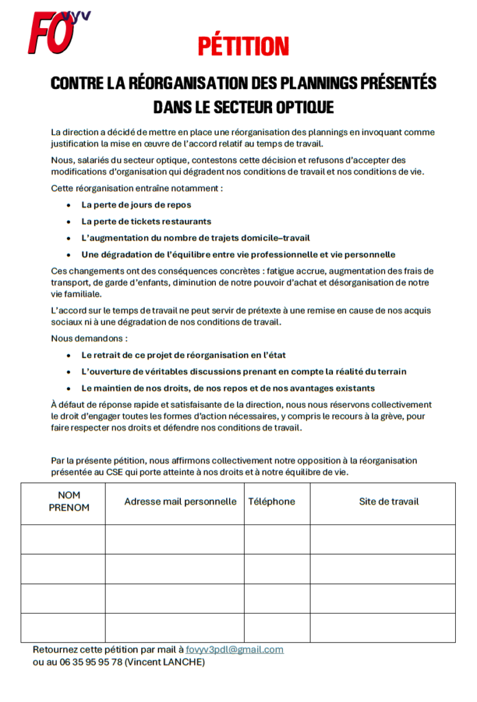 PÉTITION OPTIQUE : Non aux modifications qui dégradent nos conditions de travail et de vie! février 24, 2026 fovyv Uncategorized 0 Téléchargez la pétition sur la réorganisation optique iciTélécharger
