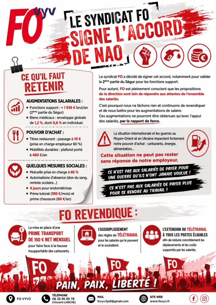 FO SIGNE l’accord de NAO mais reste mobilisé pour aller plus loin ! avril 15, 2026 fovyv Uncategorized 0 Cliquez sur ce lien pour télécharger l’integralité de l’accord de NAO 2026 2026 03 25 – Accord NAO 2026 VYV3 PDL Télécharger